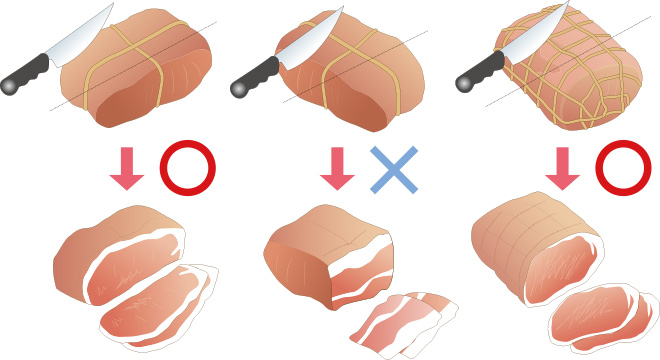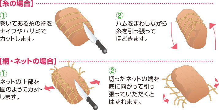 A.商品は、塩漬やスモークなどさまざまな製造過程で肉の塊が崩れないようにするため、ネットでしっかりと形を整えてあります。図のような方法ではずしてお召し上がりください。