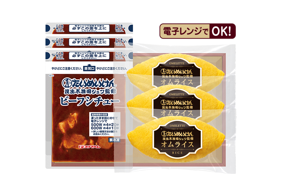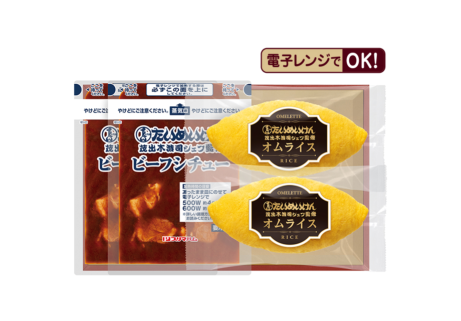 ¥4,800(税込価格 ¥5,184)オムライス 220g×3、ビーフシチュー 150g×3